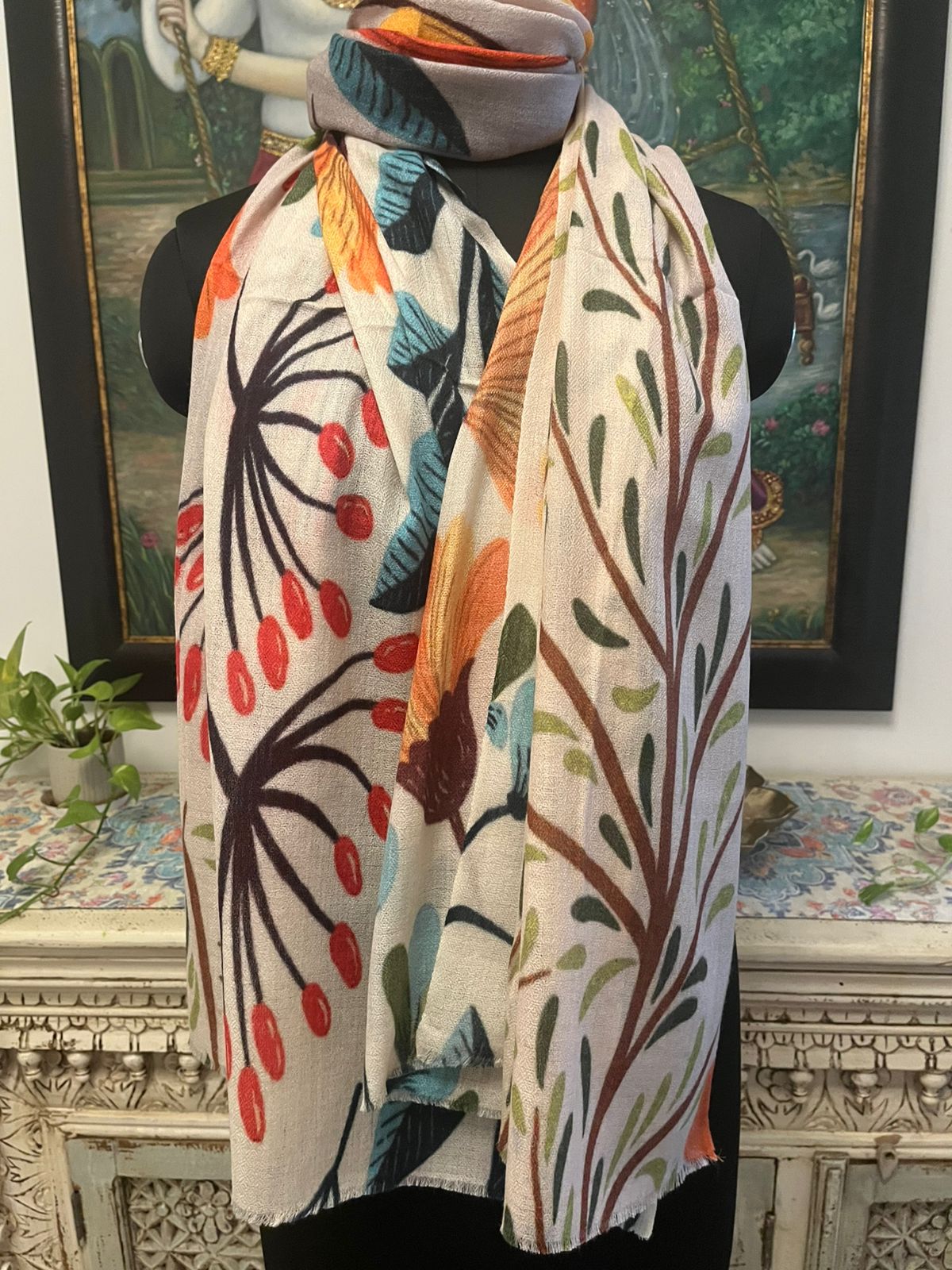 Elevate your style with this beige multicolor stole from Savita Shawls, a trusted digital print stole manufacturer known for artistic and high-quality designs. Made with a luxurious blend of 85% wool and 15% silk, this stole offers a perfect balance of softness, warmth, and elegance. The digital print showcases vibrant floral and leafy motifs in shades of red, orange, green, blue, and brown, making it a statement accessory for any outfit. Measuring 70 x 200 cms, it drapes effortlessly and complements both ethnic and contemporary attire. A versatile fashion essential that blends tradition with modern sophistication.