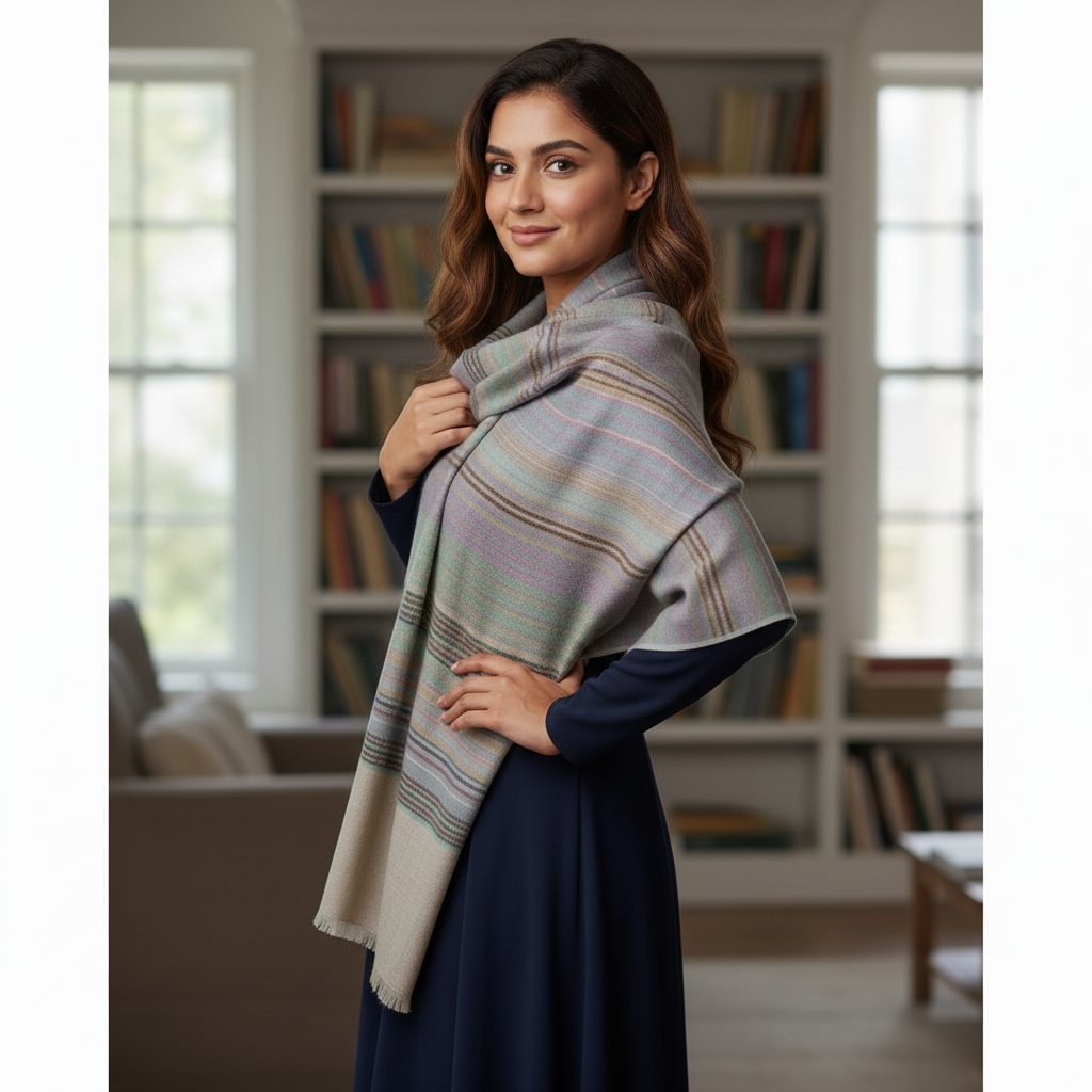 Add a touch of timeless beauty to your wardrobe with the Beige Multicolor Wool 7 Stripe Pashmina Shawls for Women from Savita Shawls. Expertly woven from fine wool, this pashmina shawls features a soothing beige base adorned with seven multicolor stripes in soft pastel shades of blue, pink, and green—perfectly balancing sophistication with vibrant charm.
