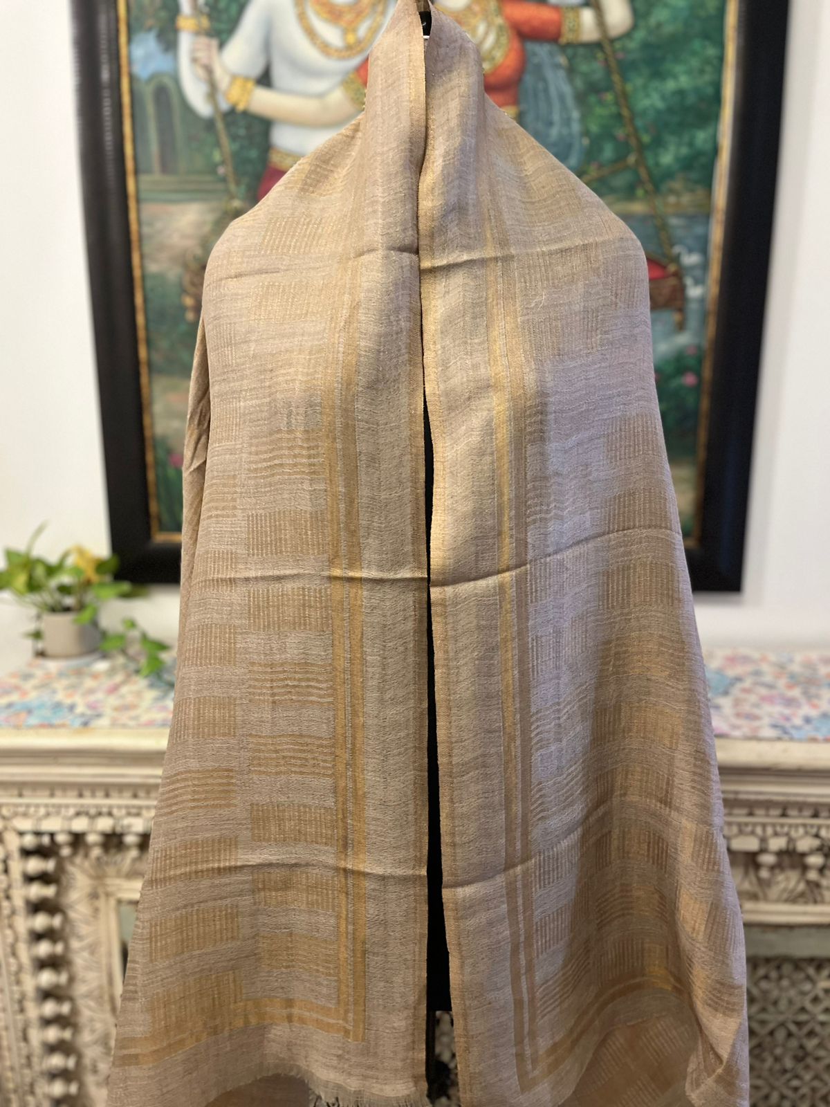 Discover timeless sophistication with this elegant beige stole from Savita Shawls, a renowned new self zari stole manufacturer. Crafted with a luxurious blend of 85% wool and 15% silk, this stole offers an incredibly soft touch with a natural sheen. The golden self-zari woven design and border add a subtle yet rich detailing, making it a perfect accessory for festive occasions, weddings, or daily wear with a touch of class. Sized at 70 x 200 cms, this versatile piece drapes beautifully over any outfit, enhancing your look with effortless grace. Elevate your collection with this refined blend of comfort and style.