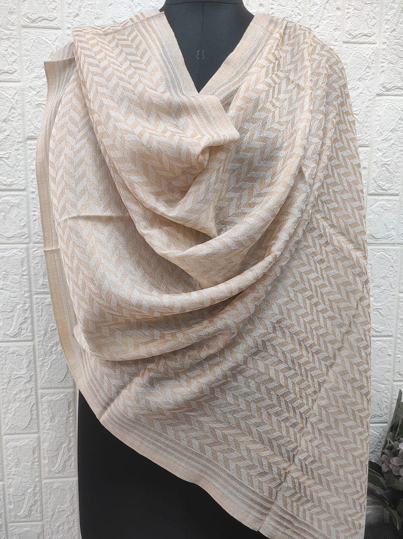 Enhance your wardrobe with this luxurious shawl from Savita Shawls, a leading shawls & scarves manufacturer/exporter. Crafted from a premium blend of 60% wool, 30% zari, and 10% silk, this exquisite piece offers the perfect balance of warmth, softness, and elegance. Measuring 70×200 cm, it features a sophisticated beige base adorned with a subtle chevron pattern that adds texture and charm. Ideal for both everyday wear and special occasions, this shawl drapes beautifully and complements a variety of outfits. Choose Savita Shawls for high-quality craftsmanship and timeless style that reflects the best in global shawl and scarf exports.
