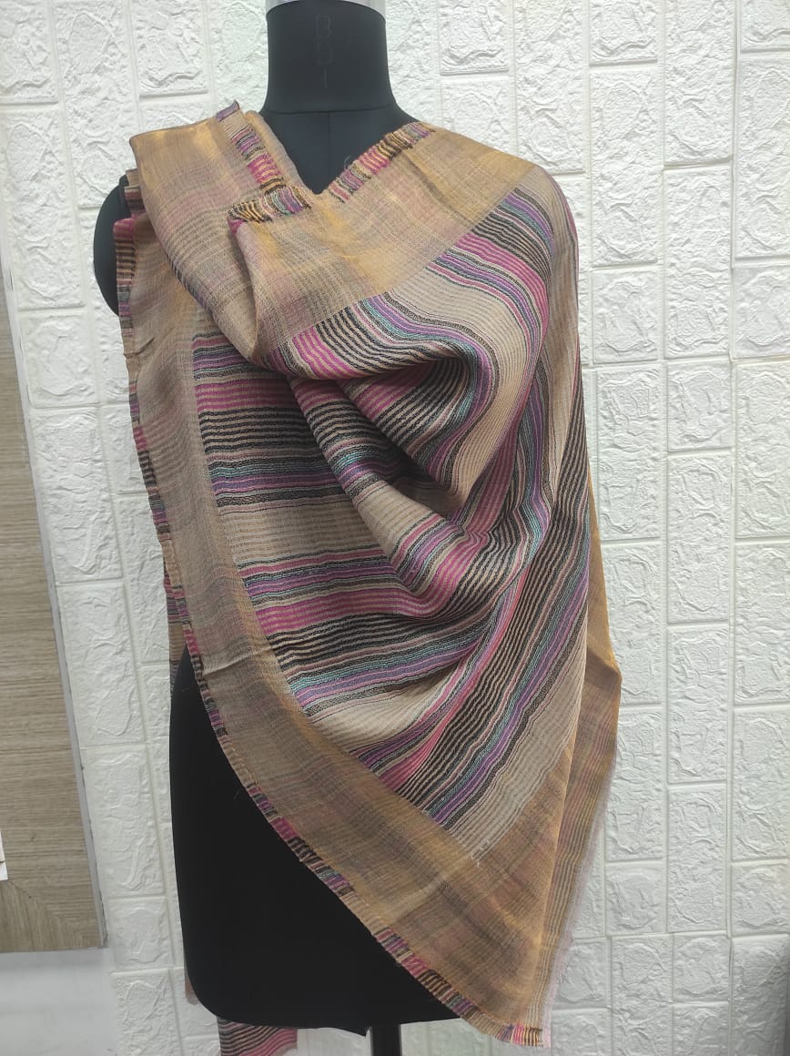 Elevate your style with this beautifully crafted scarf from Savita Shawls, a reputed designer scarves manufacturer known for blending tradition with elegance. Made from a premium blend of 85% wool and 15% silk, this scarf offers a soft, lightweight texture that provides both warmth and grace. Measuring 70×200 cms, it’s perfect for versatile styling—drape it around your neck or shoulders for a luxurious statement. The intricate striped pattern gives a contemporary yet classic appeal, ideal for any occasion, whether casual or formal. Choose Savita Shawls for refined quality and artistic expression in every thread.