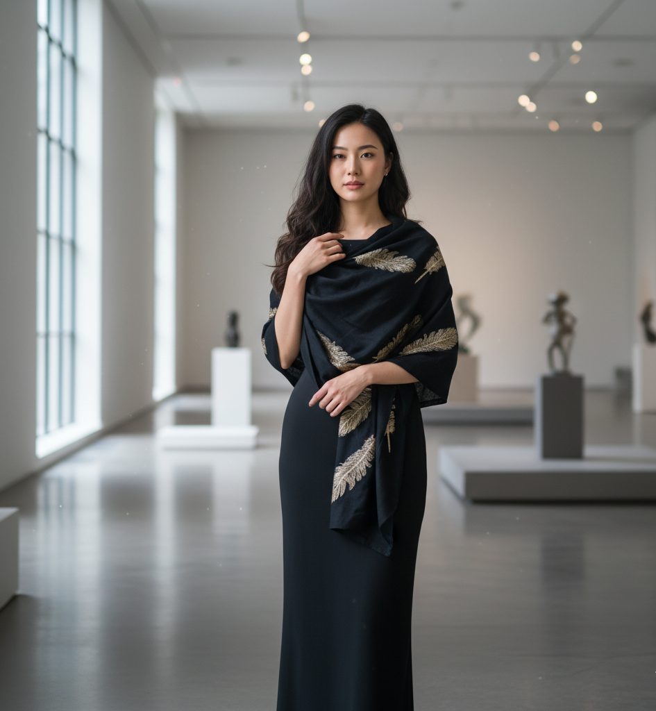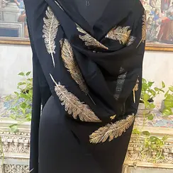 Expertly woven and detailed by renowned Shawl Manufacturers, Savita Shawls ensures every piece reflects premium craftsmanship and unmatched finesse. Make a statement of luxury and tradition with this black feather foil wool pashmina shawl — a wardrobe essential for every elegant woman.