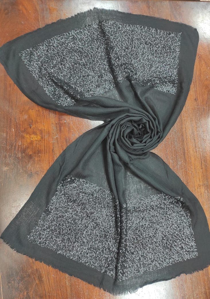 Elevate your evening look with this classic black scarf from Savita Shawls, a reputed fashion scarves manufacturer known for its trendsetting designs. Measuring 70×200 cms, this scarf is made from a premium blend of 70% polyester and 30% wool, ensuring both comfort and style. The eye-catching silver sequin embellishments on both ends add a sophisticated sparkle, making it perfect for festive occasions, formal events, or stylish everyday wear. The soft texture and elegant drape offer a luxurious feel. As a leading fashion scarves manufacturer, Savita Shawls provides high-quality scarves ideal for bulk orders and exclusive fashion collections.