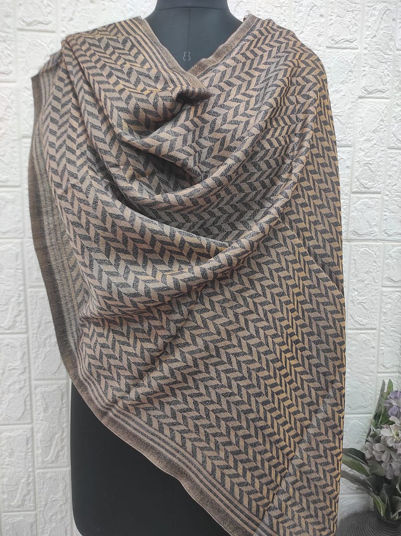 Elevate your style with this elegant shawl from Savita Shawls, a renowned shawls & scarves manufacturer/exporter known for premium quality and timeless designs. Expertly woven from 60% wool, 30% zari, and 10% silk, this shawl offers a rich texture with a soft, luxurious feel. Its bold chevron pattern in deep brown and black tones adds a sophisticated touch, perfect for both casual and formal wear. Measuring 70×200 cm, it provides a graceful drape and versatile styling options. Whether worn over the shoulders or wrapped as a scarf, this piece reflects fine craftsmanship and global appeal from Savita Shawls.