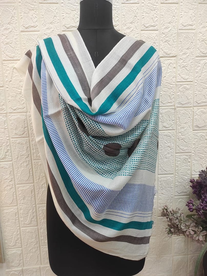 Discover effortless elegance with this contemporary printed scarf from Savita Shawls, a trusted printed scarves manufacturer known for premium quality and design. Crafted from a luxurious blend of 85% wool and 15% silk, this scarf offers a soft, lightweight feel with natural warmth. Measuring 70×200 cm, it features a modern geometric and striped print in earthy tones and cool blues, perfect for versatile styling. Whether draped over your shoulders or wrapped around the neck, it adds a chic touch to any outfit. Ideal for all seasons, this scarf is a statement of refined craftsmanship and timeless fashion.