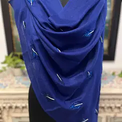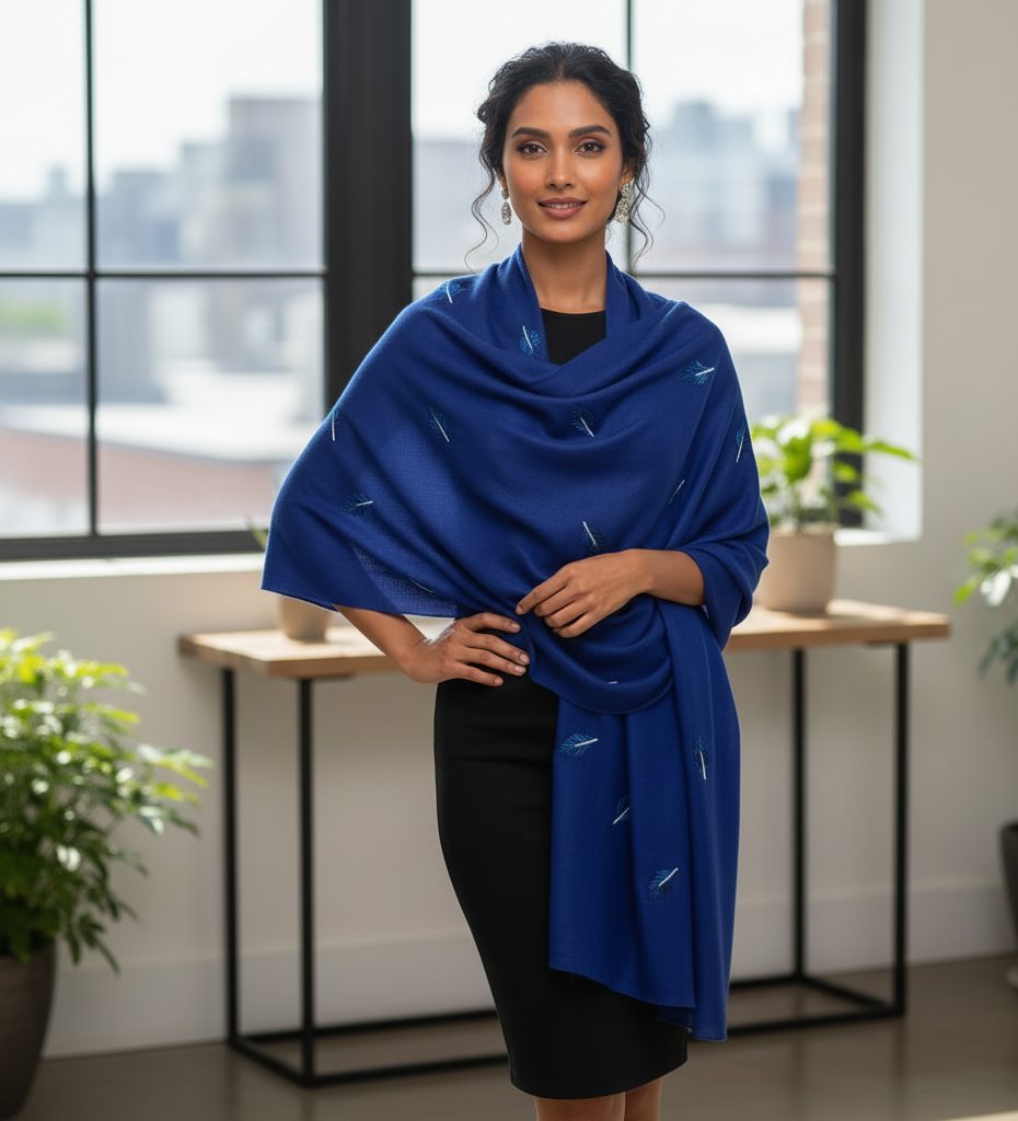 Elevate your winter elegance with the Blue Wool Kani Embroidered Pashmina Shawls for Women by Savita Shawls, a stunning creation that combines timeless beauty with fine craftsmanship. This royal blue Pashmina Shawl showcases intricate Kani-style embroidery, featuring graceful feather motifs in shades of blue and white, adding an exquisite touch of luxury to your attire.