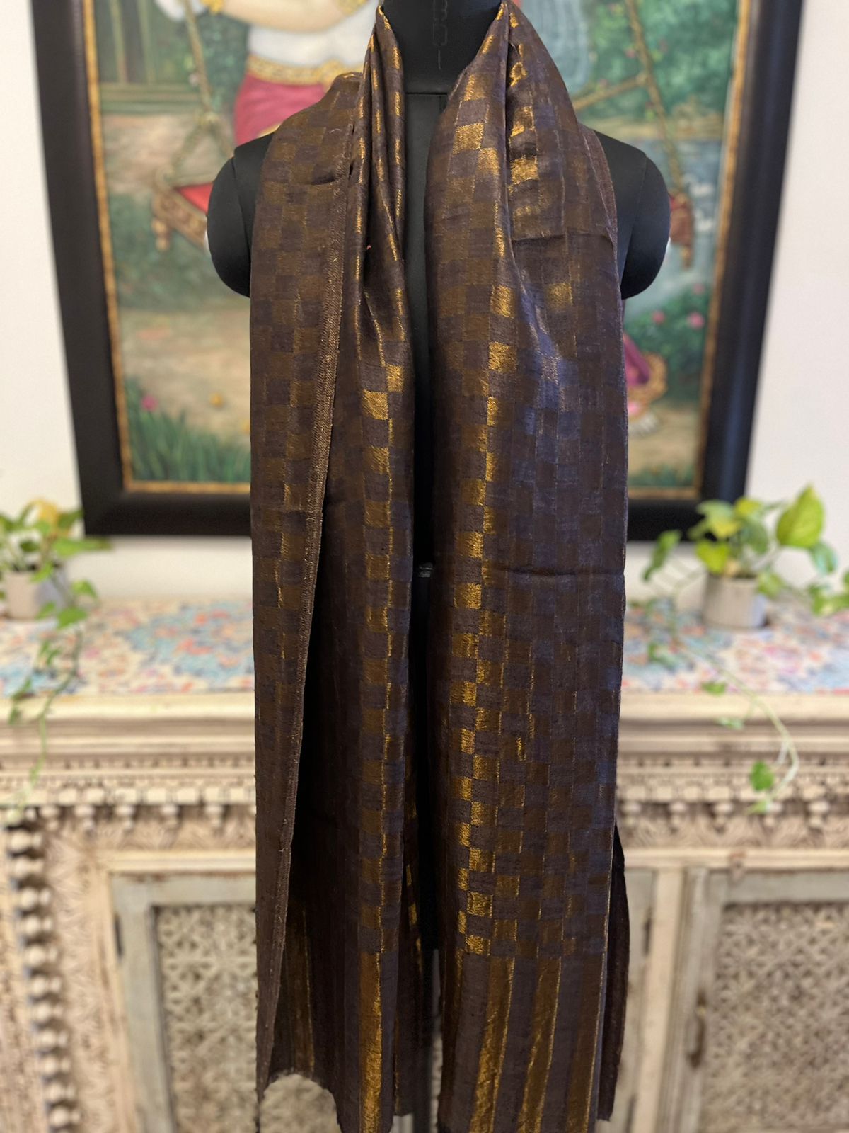 Discover the elegance of Savita Shawls, a trusted new self zari stole manufacturer blending luxury and tradition. This finely crafted stole, woven with 85% wool and 15% silk, offers a perfect balance of warmth, comfort, and a soft lustrous touch. With a size of 70 x 200 cms, it drapes gracefully, enhancing both ethnic and contemporary looks. The rich deep brown base highlighted with golden self zari checkered designs exudes sophistication and timeless charm. Ideal for festive gatherings, weddings, or evening outings, this stole is a versatile accessory that reflects refined craftsmanship and elevates your style effortlessly.
