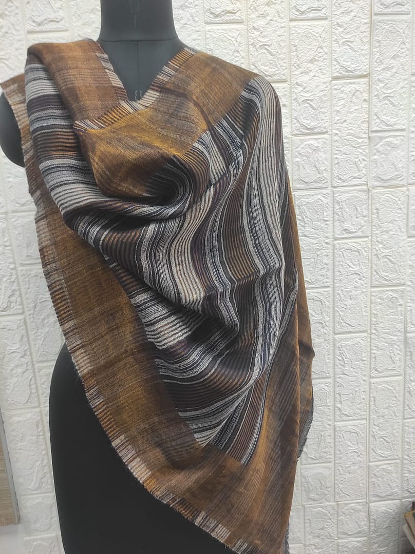 Introducing this sophisticated wool-silk blend scarf from Savita Shawls, a trusted designer scarves manufacturer. This scarf, measuring 70×200 cm, is made from 85% wool and 15% silk, offering unmatched comfort and graceful drape. The elegant design features a harmonious mix of earthy tones—deep browns, golden mustard, charcoal, ivory, and black—arranged in artistic horizontal and vertical stripes. Ideal for formal and casual wear, it adds a touch of refined style to any outfit. The luxurious texture and timeless colour palette make it a perfect accessory for all seasons and occasions. An essential piece for modern wardrobes.