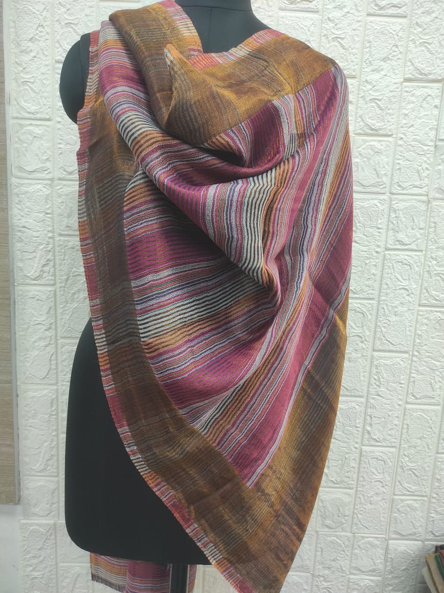 Enhance your style with this eye-catching striped scarf from Savita Shawls, a leading designer scarves manufacturer known for blending tradition with trend. Expertly crafted from a luxurious blend of 85% wool and 15% silk, this scarf offers a soft touch and cozy feel, perfect for all-day wear. Sized at 70×200 cms, it is ideal for versatile draping and layering. The vibrant color palette and intricate stripe design add a bold, contemporary flair, making it a standout accessory for both casual and formal ensembles. Trust Savita Shawls for premium quality and stylish design in every scarf.