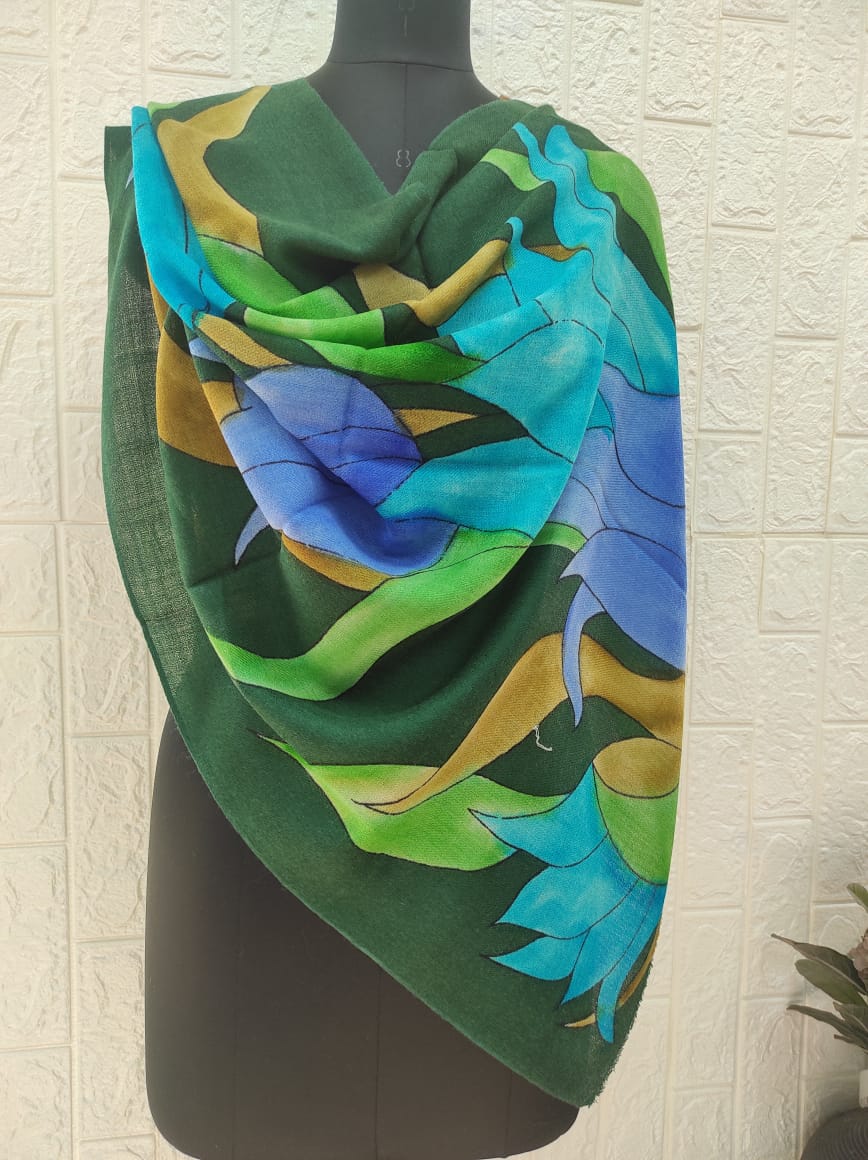 Measuring 70×200 cms, this versatile shawl can be styled as a wrap, stole, or elegant drape for festive occasions, evening outings, or casual gatherings. The intricate floral hand-painting highlights fine detailing, adding a sophisticated touch to your winter wardrobe.