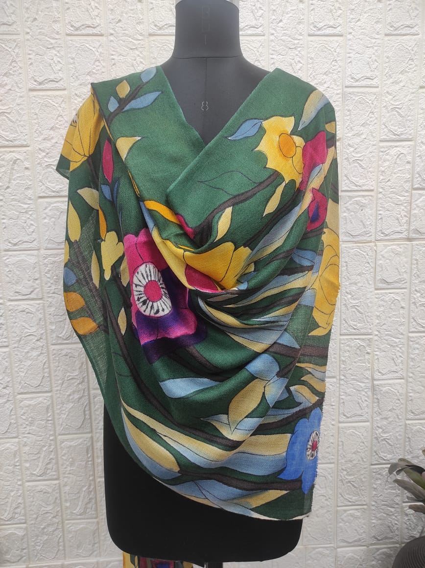 Add a burst of elegance and color to your wardrobe with Savita Shawls’ exclusive Pashmina Shawls, hand-painted to perfection in radiant hues of yellow, pink, blue, and green. Each piece showcases the fine craftsmanship and timeless appeal that define authentic Pashmina Shawls. The vivid floral patterns on a deep emerald green base make this design a statement of luxury and individuality.