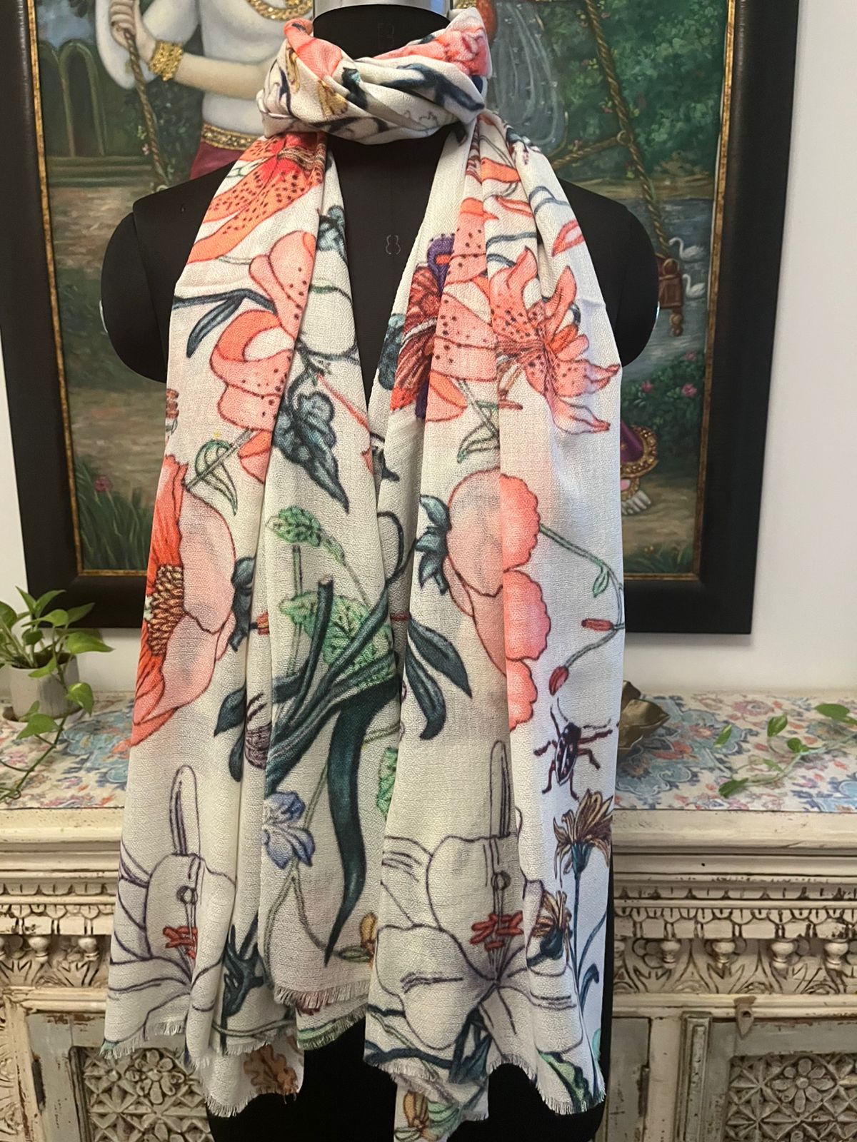 Add a refreshing charm to your collection with this off-white multicolor stole from Savita Shawls, a renowned digital print stole manufacturer known for blending tradition with modern artistry. Made with a luxurious mix of 85% fine wool and 15% silk, this stole offers unmatched softness, warmth, and a graceful fall. The digital print showcases beautifully detailed floral patterns in hues of coral, green, blue, and white, giving it a vibrant yet elegant appeal. Measuring 70 x 200 cms, it is versatile enough to style with ethnic outfits or contemporary wear. A perfect accessory for chic, sophisticated dressing.