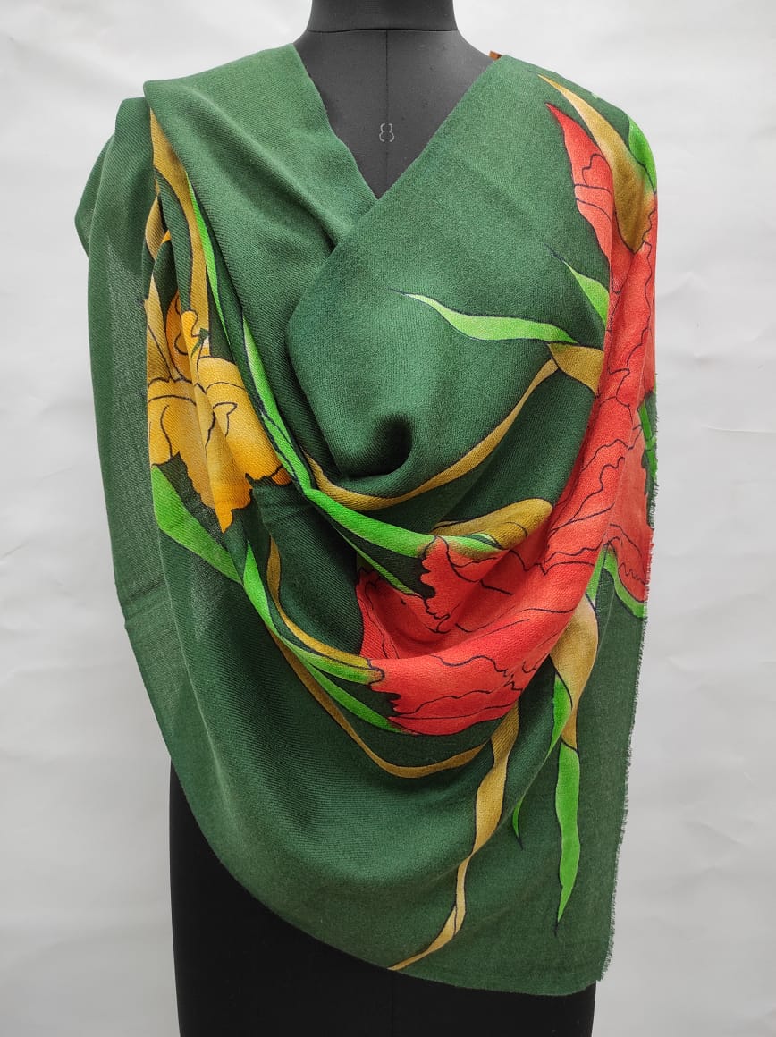Savita Shawls, one of the renowned Shawl Manufacturers, brings you authentic craftsmanship and unmatched finesse in every creation. The artistic floral patterns on this green Pashmina Shawl make it a must-have for women who appreciate luxury and elegance with a touch of hand-painted charm.