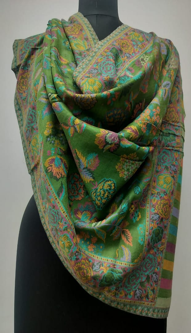 Add a vibrant touch to your winter style with this stunning green shawl from Savita Shawls, a renowned winter shawls & scarves manufacturer. Expertly woven with a premium blend of 85% wool and 15% silk, it offers both warmth and elegance. The shawl, measuring 70×200 cm, features a rich green base adorned with intricate floral and paisley motifs in yellow, pink, blue, and orange hues. Its soft texture and luxurious drape make it a perfect accessory for both casual and festive outfits. Embrace heritage craftsmanship and modern design with this timeless winter essential from Savita Shawls.