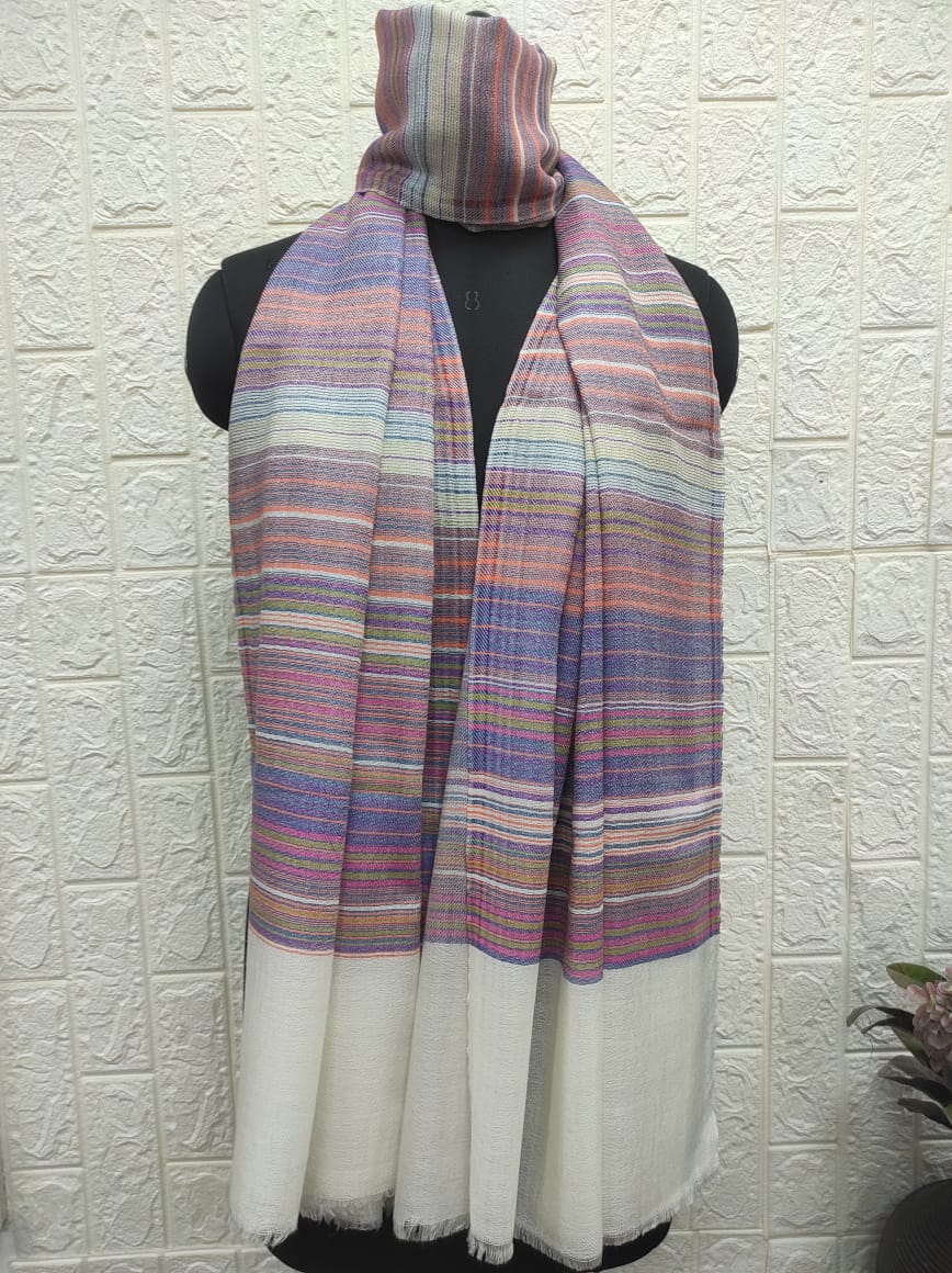 Experience vibrant sophistication with the Ivory Multicolor Wool 7 Stripe Pashmina Shawls for Women from Savita Shawls. Handwoven to perfection, these pashmina shawls feature an elegant ivory base adorned with delicate multicolor stripes in hues of pink, purple, green, and orange — creating a stunning fusion of warmth and style.