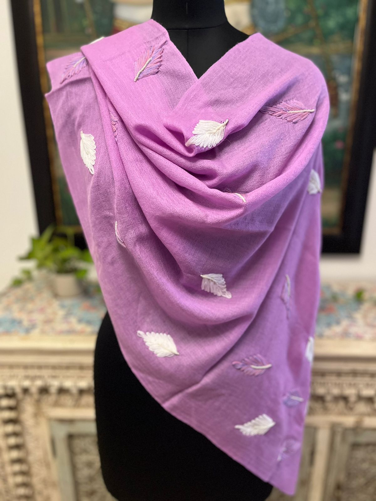 Indulge in luxurious comfort and timeless elegance with the Lavender Wool Kani Embroidered Pashmina Shawls for Women by Savita Shawls. This stunning Pashmina Shawl features intricate hand embroidery inspired by traditional Kani craftsmanship, adorned with delicate white and lilac feather motifs that enhance its soft lavender base. The pastel hue adds a graceful charm, making it a perfect companion for festive gatherings, winter evenings, or elegant daytime wear.