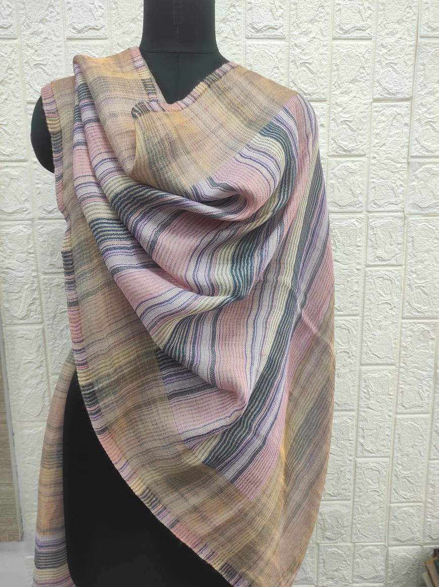 Wrap yourself in subtle luxury with this elegant wool-silk scarf by Savita Shawls, a renowned designer scarves manufacturer. Measuring 70×200 cm and made from 85% wool and 15% silk, this scarf offers a soft, breathable texture ideal for all seasons. The design features a pastel-toned palette with light pink, soft lavender, pale mustard, sky blue, ivory, and muted green stripes, giving it a breezy and graceful appeal. The gentle interplay of colors adds a delicate charm to both casual and semi-formal outfits. Lightweight yet cozy, this scarf is a refined addition to any accessory collection.