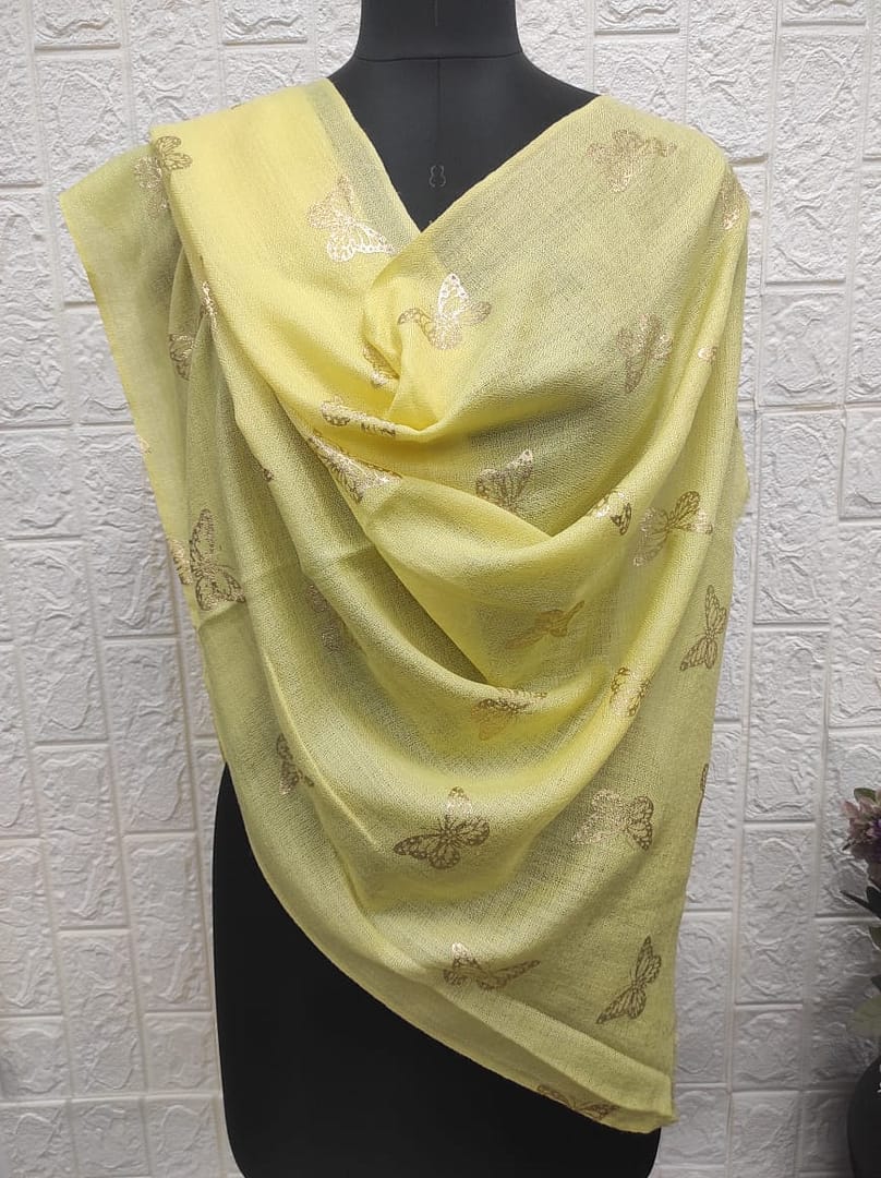 Introducing an elegant addition from Savita Shawls, this light yellow fashion scarf is a perfect blend of style and sophistication. Crafted from a soft, breathable fabric, it features delicate golden butterfly motifs that add a touch of charm and grace. Ideal for both casual and festive occasions, this scarf drapes beautifully and enhances any outfit effortlessly. As a trusted fashion scarves manufacturer, Savita Shawls ensures quality craftsmanship and timeless appeal in every piece. Elevate your wardrobe with this stylish accessory that offers comfort, elegance, and durability – a true testament to our dedication to fine fashion scarves.