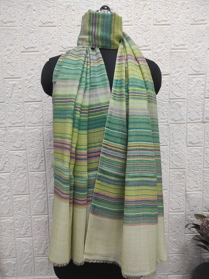 Bring a breath of freshness to your wardrobe with the Mint Green Wool 7 Stripe Pashmina Shawls for Women from Savita Shawls. Crafted with exquisite care, these pashmina shawls feature soothing shades of green, yellow, and lilac in fine striped patterns, creating a harmonious fusion of color and craftsmanship.