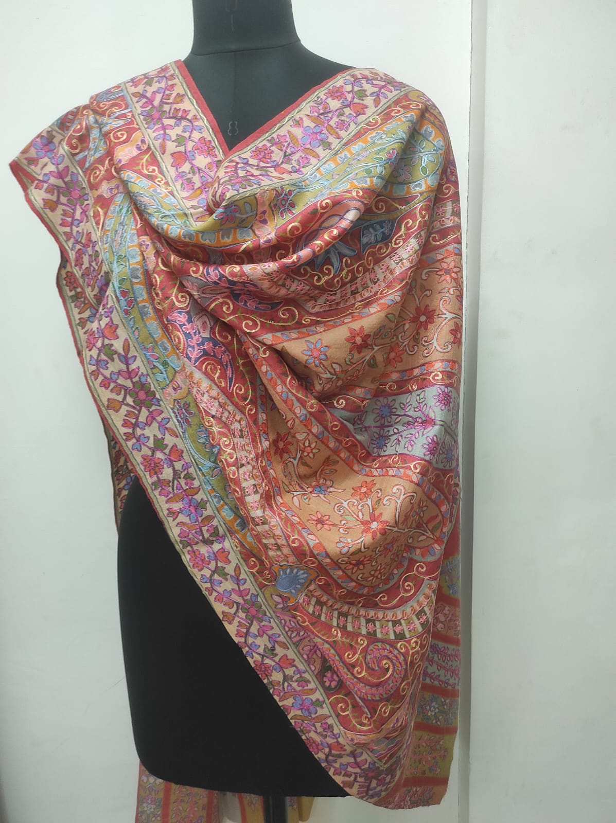 Celebrate timeless artistry with Savita Shawls’ Multicolor Wool Hand Kalamkari Embroidery Pashmina Shawl, a masterpiece of heritage and elegance. Handcrafted by skilled artisans, this stunning shawl showcases intricate kalamkari embroidery featuring floral and paisley motifs in shades of red, pink, orange, blue, and gold.