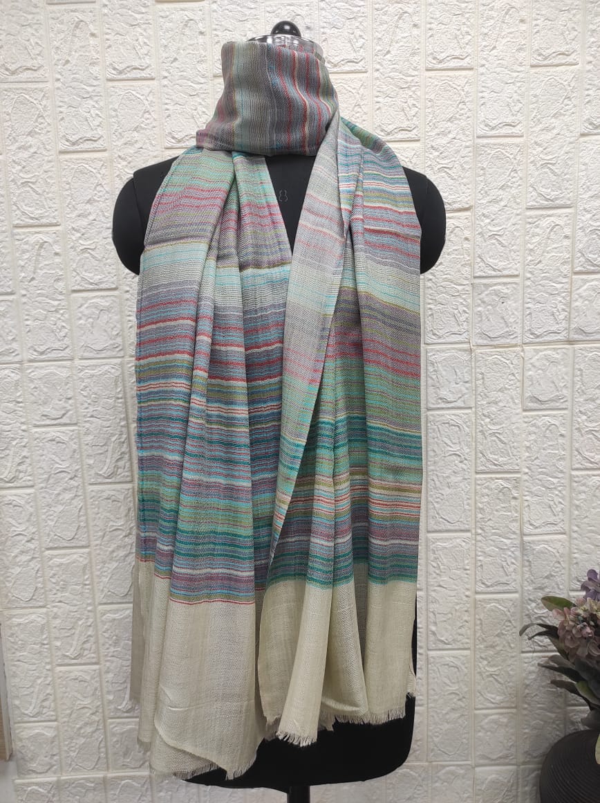 Wrap yourself in timeless beauty with the Multicolour Wool 7 Stripe Pashmina Shawl by Savita Shawls. Expertly crafted from premium wool, this pashmina shawl features a stunning array of seven soft-toned stripes in pastel hues, adding elegance and warmth to your winter wardrobe. Its lightweight yet cosy texture makes it an ideal choice for both casual outings and formal occasions.