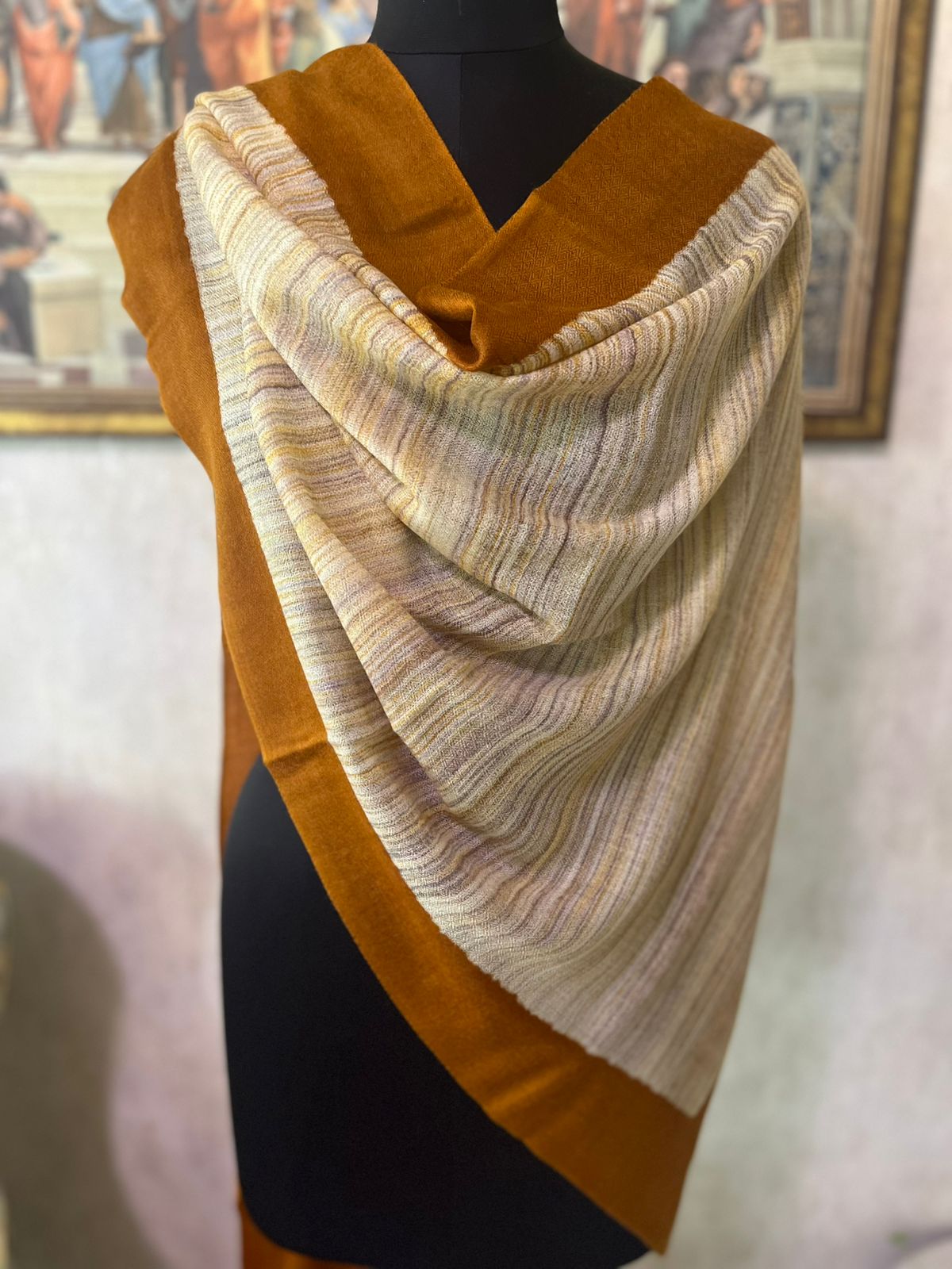 Be the first to review “Mustard & Beige Wool Brush Paint Pashmina Shawls for Women”