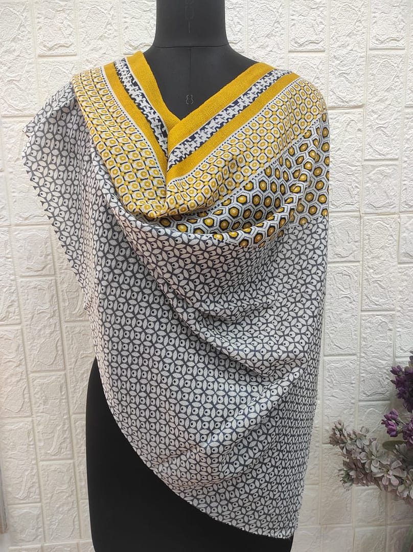 Elevate your style with this intricately designed scarf from Savita Shawls, your trusted printed scarves manufacturer. Featuring a rich mix of mustard yellow and monochrome geometric prints, this scarf is a stunning fusion of tradition and trend. Crafted with a luxurious blend of 85% wool and 15% silk, it offers unmatched softness and warmth. With a generous size of 70×200 cm, it’s perfect for layering over any outfit. Whether you’re dressing for work or an evening outing, this versatile accessory adds a vibrant, artistic edge. Discover timeless fashion with Savita Shawls’ premium printed scarf collection.