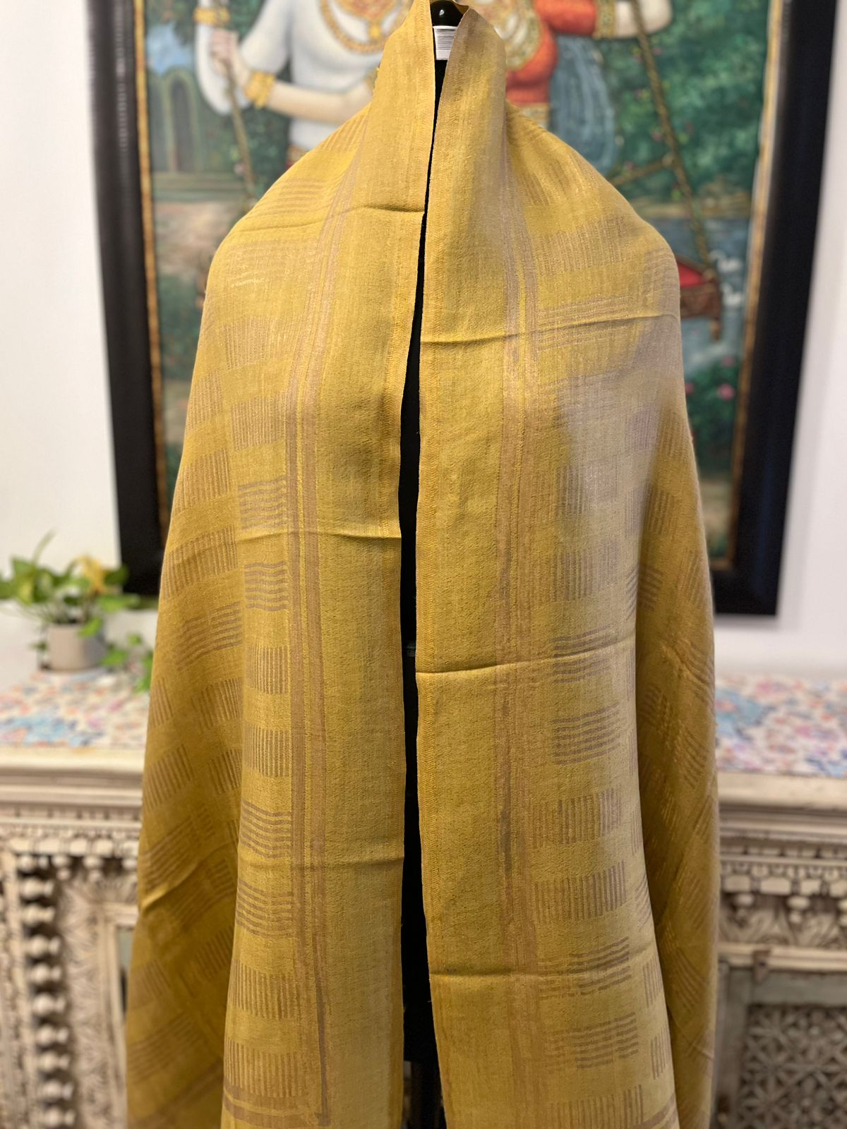 Discover timeless elegance with Savita Shawls, a trusted new self zari stole manufacturer known for its craftsmanship and quality. This exquisite stole, sized at 70 x 200 cms, is crafted from a premium blend of 85% fine wool and 15% silk, offering both warmth and a soft luxurious drape. The rich mustard yellow tone enhanced with delicate self zari patterns adds sophistication, making it a versatile accessory for festive occasions, formal gatherings, or everyday elegance. Lightweight yet cozy, this stole is a perfect blend of tradition and modern style, designed to elevate your wardrobe with understated luxury.