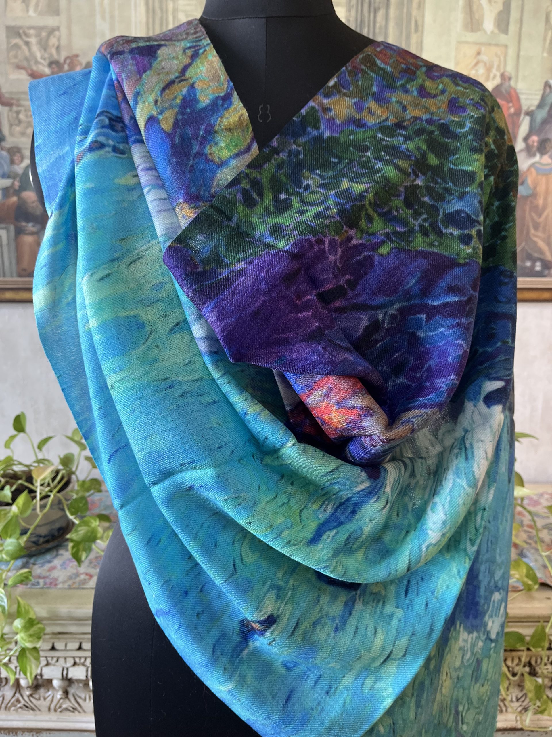 Dive into elegance with Pashmina Shawls from Savita Shawls, featuring a mesmerizing ocean blue abstract digital print that blends deep sea hues of turquoise, violet, and emerald green. This luxurious wool pashmina shawl embodies the essence of artistic craftsmanship and timeless sophistication, making it the perfect statement piece for modern women.