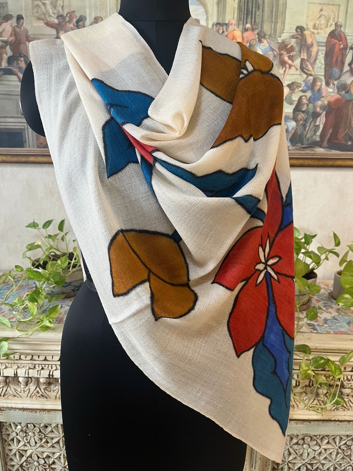 Be the first to review “Off-White Wool Hand-Painted Pashmina Shawl with Multicolor Floral Design”
