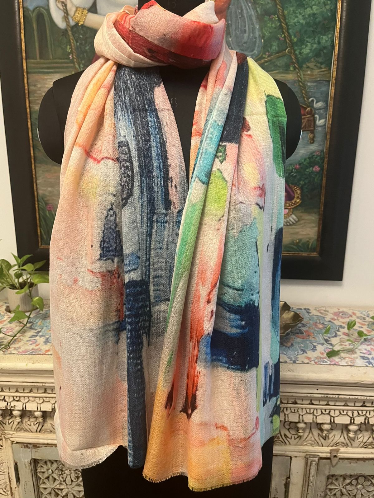 Elevate your style with this vibrant multicolor stole from Savita Shawls, a trusted digital print stole manufacturer known for exquisite artistry. Crafted with a premium blend of 85% wool and 15% silk, this stole offers unmatched softness, warmth, and a delicate sheen. The abstract digital print combines bold strokes of red, blue, green, peach, and yellow, creating a modern artistic appeal. Measuring 70 x 200 cms, it drapes beautifully and adds a splash of elegance to any outfit. Perfect for both casual and festive occasions, this stole blends luxury with contemporary fashion, making it a timeless accessory.