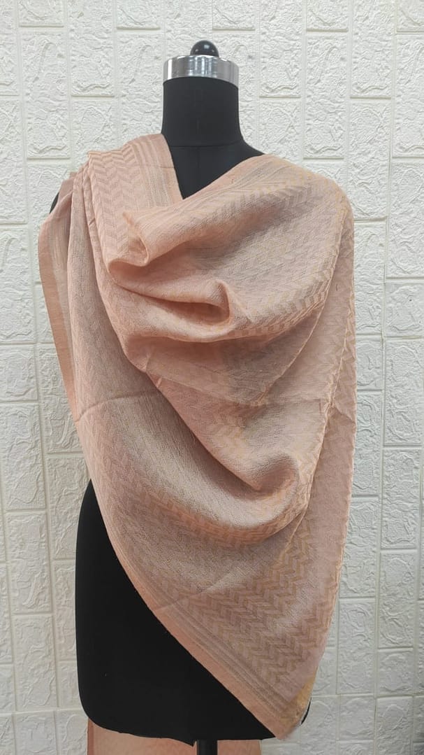 Add soft sophistication to your wardrobe with this beautifully woven peach-toned stole from Savita Shawls. Crafted in a luxurious 60% wool, 30% zari, and 10% silk blend, this 70×200 cm piece combines a delicate texture with a subtle chevron pattern, offering both warmth and elegance. Its pastel hue makes it a versatile accessory for day-to-night styling across seasons. As a leading shawls & scarves manufacturer/exporter, Savita Shawls specializes in delivering premium-quality pieces tailored for global fashion markets and private labels. Elevate your collection with this timeless design that reflects both craftsmanship and contemporary elegance.
