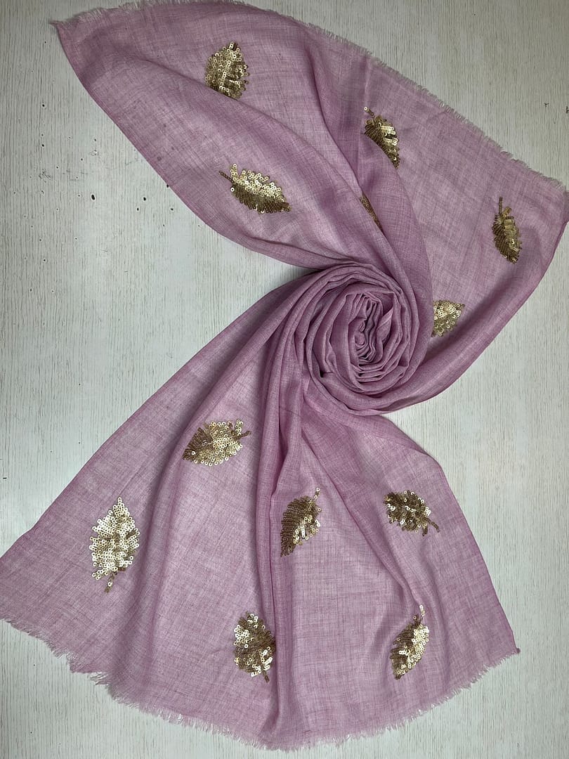 Add a pop of elegance to your outfit with this stylish pink scarf from Savita Shawls, a trusted fashion scarves manufacturer. Measuring 70×200 cms, this chic accessory is crafted from a soft blend of 70% polyester and 30% wool, offering both comfort and warmth. Adorned with shimmering gold sequin leaf motifs, it brings a festive and trendy appeal perfect for casual wear, parties, or gifting. The delicate fringed edges and light drape make it versatile for all seasons. At Savita Shawls, we specialize in fashionable scarves designed to elevate modern wardrobes. Bulk orders are welcomed for fashion-forward collections.