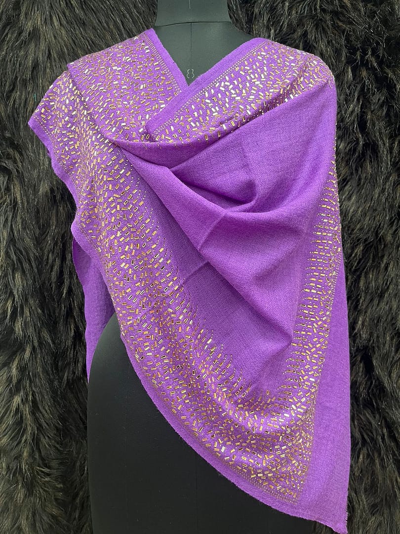 Add a vibrant touch to your ensemble with this stunning purple designer scarf by Savita Shawls, a distinguished designer scarves manufacturer committed to luxury and style. Expertly crafted from a superior blend of 85% wool and 15% silk, this scarf offers a rich texture with a graceful, soft drape. Measuring 70×200 cms, it features elegant embellishments in golden tones, creating a dazzling border that enhances its regal charm. Ideal for festive occasions or evening wear, this handcrafted scarf reflects timeless beauty and skilled artistry. Choose Savita Shawls to experience tradition, finesse, and premium quality in every designer piece.