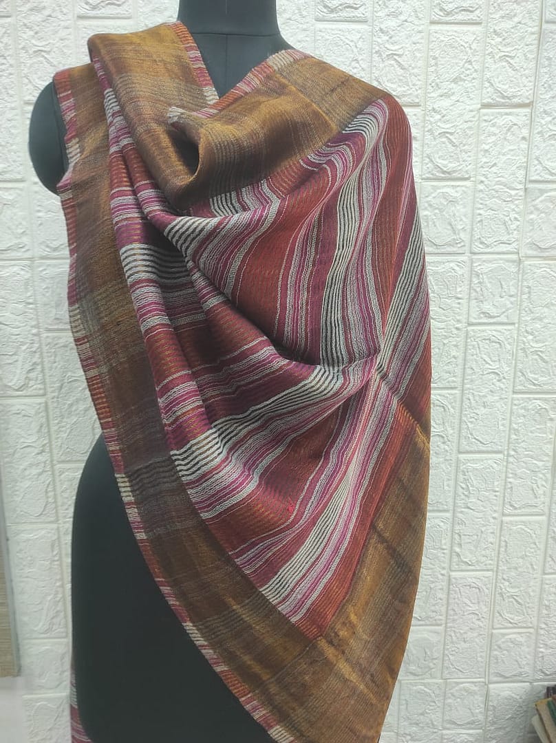 Add a pop of refined elegance to your wardrobe with this stunning wool-silk scarf by Savita Shawls, a leading designer scarves manufacturer. Crafted from a luxurious blend of 85% wool and 15% silk, this scarf offers warmth, softness, and a graceful drape. The 70×200 cms size ensures it can be worn in multiple styles, making it ideal for both formal and casual wear. The richly woven texture and detailed stripes highlight the craftsmanship and artistry that define the Savita Shawls brand. Elevate any outfit with this timeless accessory designed to impress.
