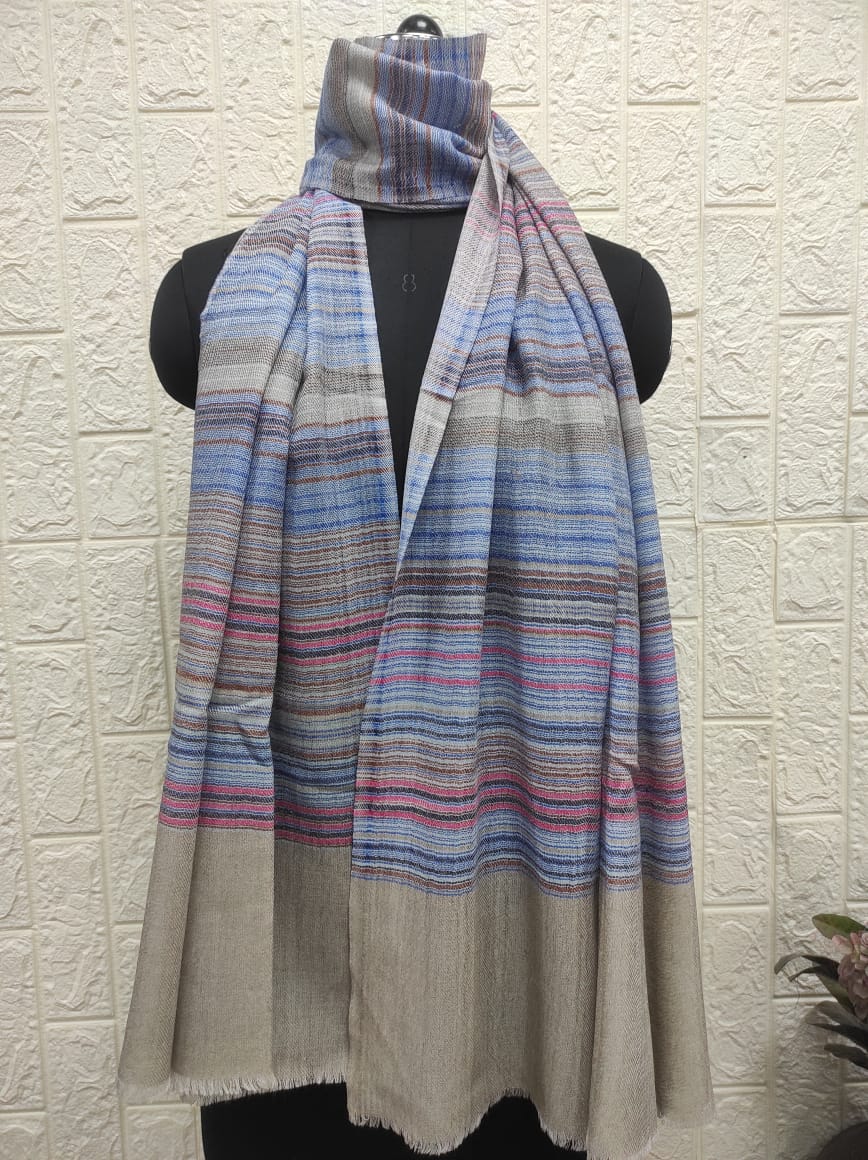 Wrap yourself in luxury with the Sky Beige Wool 7 Stripe Pashmina Shawls for Women from Savita Shawls. Expertly woven with intricate craftsmanship, these pashmina shawls showcase a harmonious blend of soft beige and serene sky-blue tones highlighted with subtle pink, brown, and purple stripes. The elegant gradient adds a sophisticated charm to every outfit.