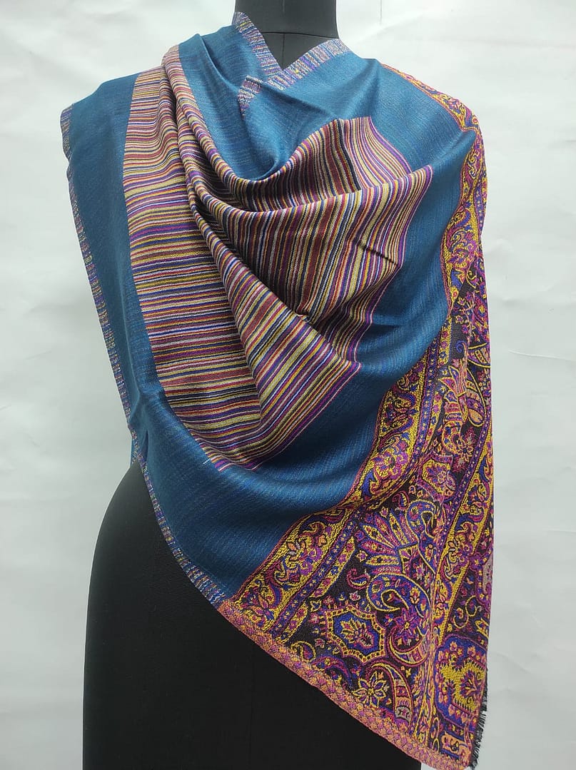 Add a touch of elegance to your wardrobe with this stunning creation by Savita Shawls, a renowned summer shawl manufacturer. Made from luxurious 100% modal fabric, this shawl offers both comfort and sophistication. Sized at 70×200 cm, it’s perfect for versatile styling. The shawl features a rich teal blue base, paired with vibrant multicolored stripes in hues of red, orange, yellow, and purple, creating a striking visual appeal. The intricate paisley pattern in magenta, gold, and purple along the border further elevates the design, making it an exquisite accessory for both casual and formal occasions.