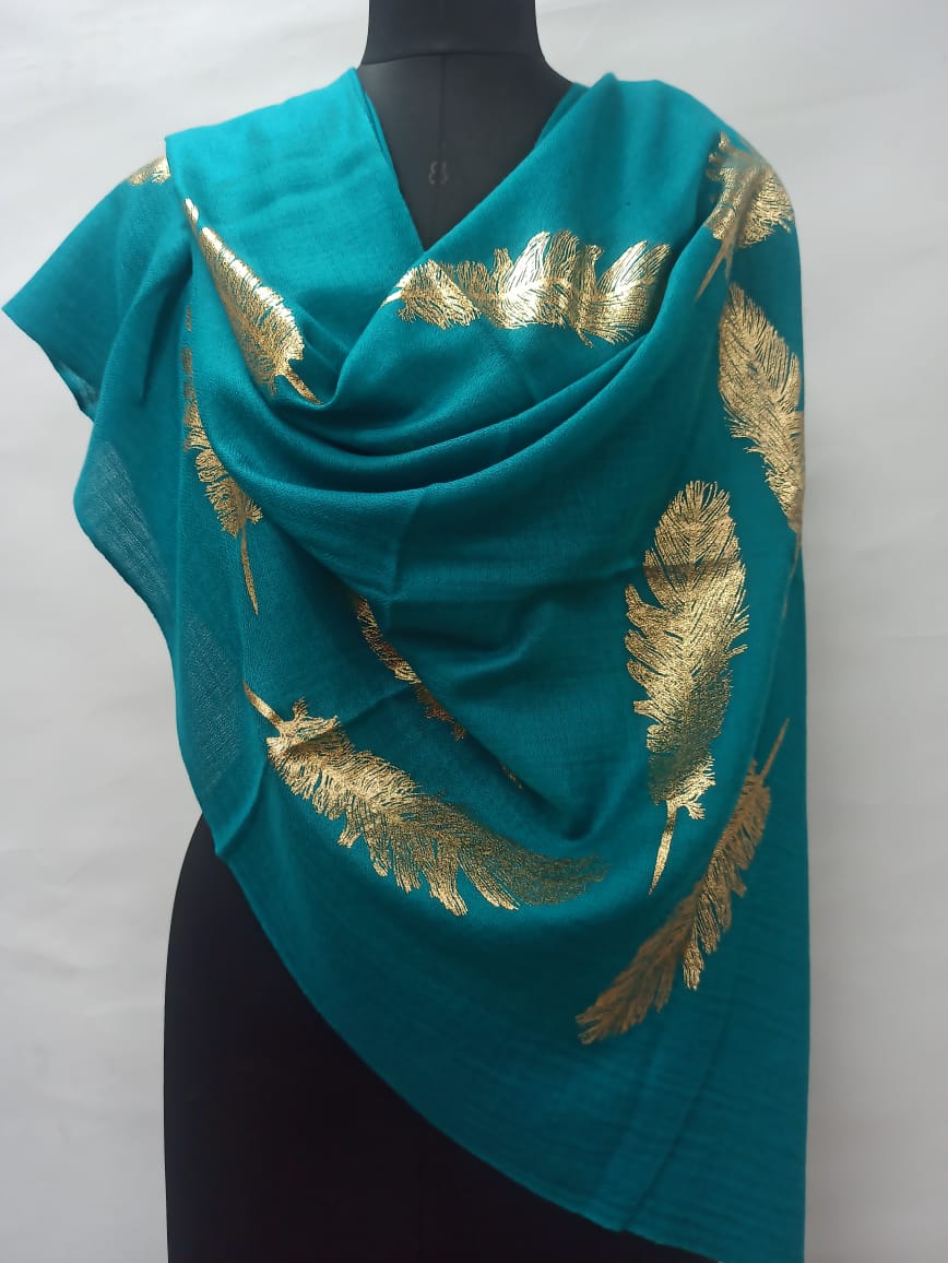 Teal Feather Foil Wool Pashmina Shawls for Women