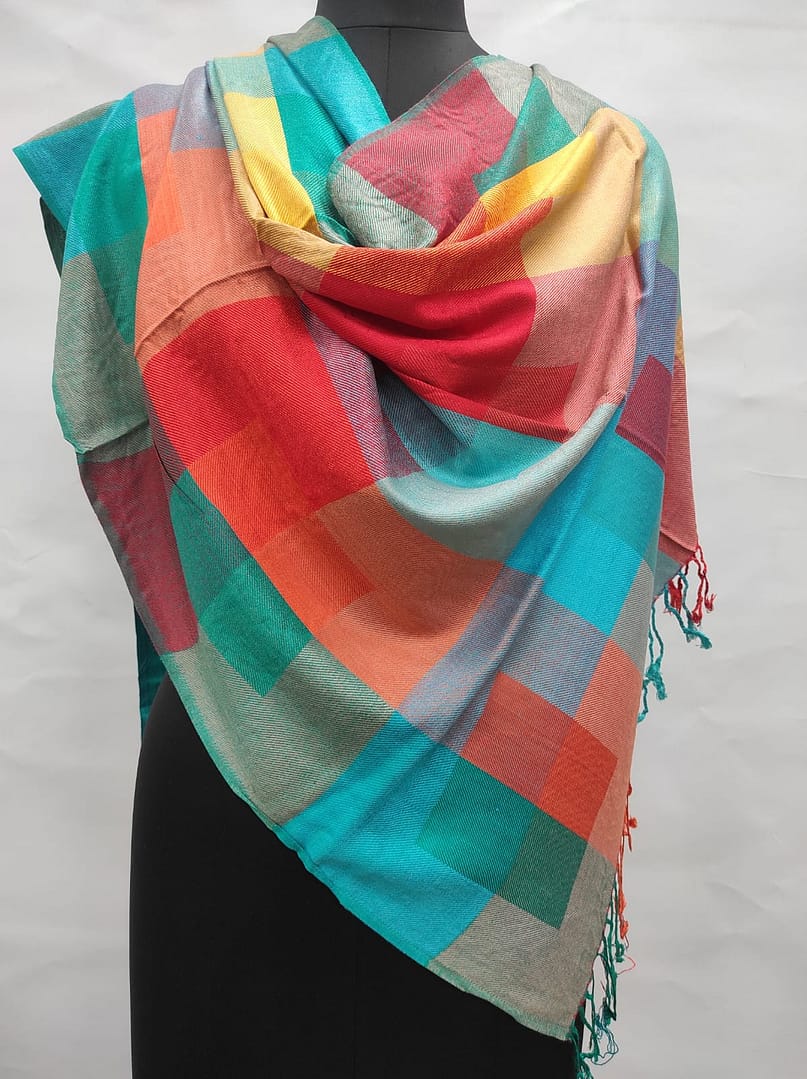 Add a pop of color to your wardrobe with this stunning multicolor checked scarf by Savita Shawls, a trusted viscose scarves manufacturer. Crafted from 100% premium modal, this scarf offers an ultra-soft touch and graceful drape, perfect for all seasons. The vibrant palette of turquoise, red, orange, and yellow blocks creates a modern yet timeless look. Sized at 70×200 cm, it provides versatile styling—wear it as a wrap, stole, or scarf. Whether you’re accessorizing a casual outfit or elevating a formal look, this modal scarf is a must-have statement piece from a leading manufacturer in fashion accessories.