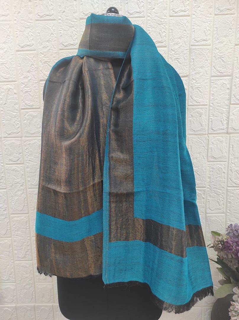 Presenting a luxurious shawl from Savita Shawls, a prominent shawl & scarves manufacturer known for timeless elegance and exceptional quality. Crafted from a fine blend of 85% wool and 15% silk, this shawl offers a soft, breathable texture with a graceful drape. Measuring 70×200 cm, it is the perfect accessory for both everyday wear and special occasions. The design features a vibrant turquoise blue base contrasted with deep charcoal black and subtle bronze brown undertones, creating a refined and striking visual appeal. This contemporary color scheme adds versatility and flair to any wardrobe.