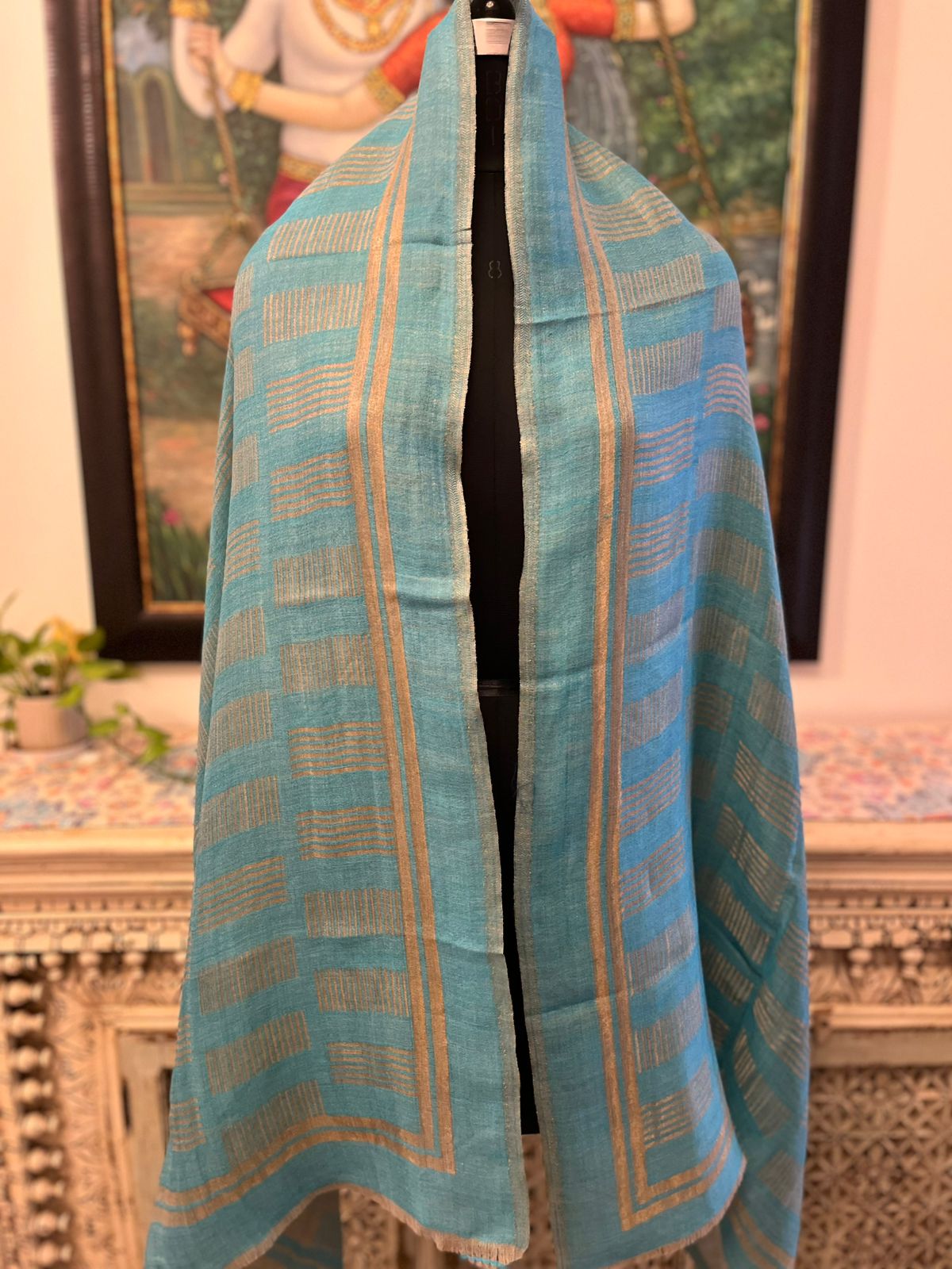 Enhance your style with this exquisite turquoise blue stole from Savita Shawls, a trusted new self zari stole manufacturer. Crafted with a luxurious blend of 85% wool and 15% silk, this stole offers a soft, smooth texture with a graceful drape. The elegant self-zari weave in shimmering golden tones adds a refined charm, making it perfect for festive occasions, parties, or everyday elegance. Measuring 70 x 200 cms, this versatile accessory pairs beautifully with both traditional and contemporary outfits. Elevate your wardrobe with the timeless beauty of this zari-detailed stole that combines comfort, craftsmanship, and sophistication.