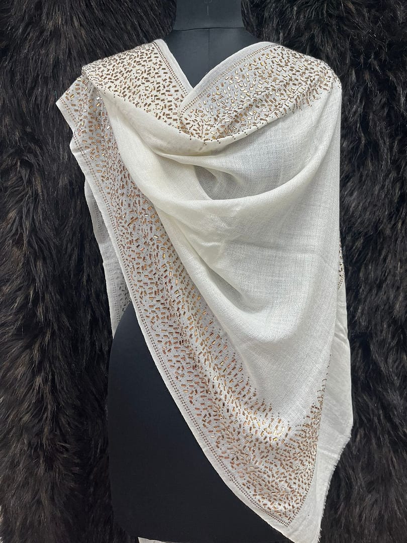 Discover timeless elegance with this exquisite designer scarf from Savita Shawls, your trusted designer scarves manufacturer. Crafted in a luxurious blend of 85% wool and 15% silk, this scarf offers unmatched softness, warmth, and a gentle sheen. Measuring 70×200 cms, it features delicate hand embellishments with intricate detailing that adds a sophisticated charm to any outfit. Ideal for both casual and formal occasions, this piece reflects true craftsmanship and refined taste. Perfect for fashion-forward individuals looking for a blend of comfort and style, this scarf is a statement accessory for every season. Experience artisanal quality with Savita Shawls.