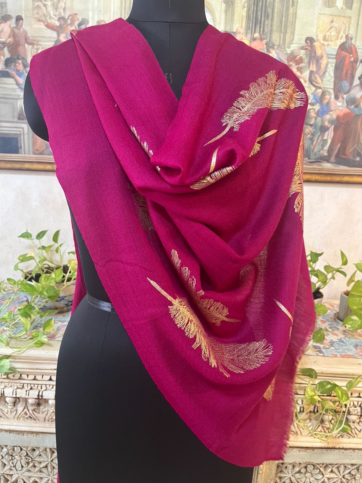 Expertly woven by renowned Shawl Manufacturers, every piece from Savita Shawls reflects superior craftsmanship and timeless artistry. Add this exquisite wine feather foil design to your wardrobe and make every appearance effortlessly elegant.