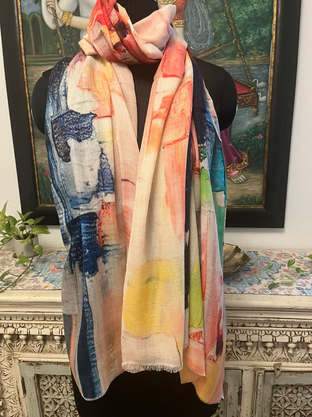 Make a bold style statement with this off-white multicolor abstract stole from Savita Shawls, a reputed digital print stole manufacturer known for premium craftsmanship and modern designs. Crafted from 85% fine wool and 15% silk, this stole offers a luxurious texture with a soft, lightweight drape. The digital print features artistic splashes of blue, yellow, peach, red, and green, giving it a contemporary and vibrant appeal. Measuring 70 x 200 cms, it is versatile enough to pair with both ethnic ensembles and western wear. A perfect accessory for those who love combining comfort with high-fashion elegance.