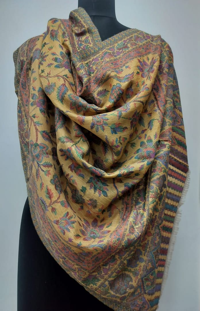 Add a regal touch to your winter ensemble with this beautifully detailed shawl from Savita Shawls, a renowned winter shawls & scarves manufacturer. Made from a luxurious blend of 85% wool and 15% silk, this shawl offers exceptional warmth, softness, and a graceful drape. The rich mustard base is elegantly woven with floral and paisley motifs in vibrant shades, making it a perfect accessory for traditional and contemporary outfits alike. Measuring 70×200 cms, it’s an ideal wrap for cooler days or festive occasions. Choose timeless elegance with this artisan-crafted winter essential from Savita Shawls.
